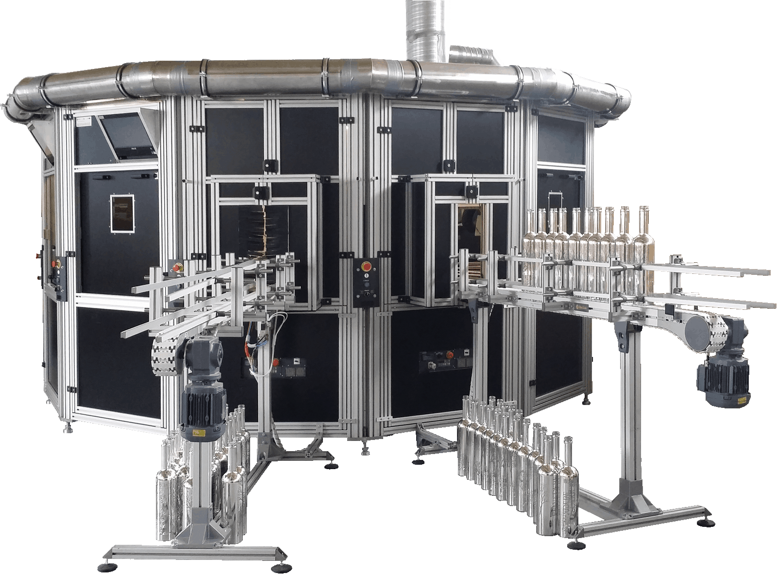 Przykład zadruku na butelce o zmiennym przekroju dodatkowo pokrytej spiralnymi wgłębieniami.