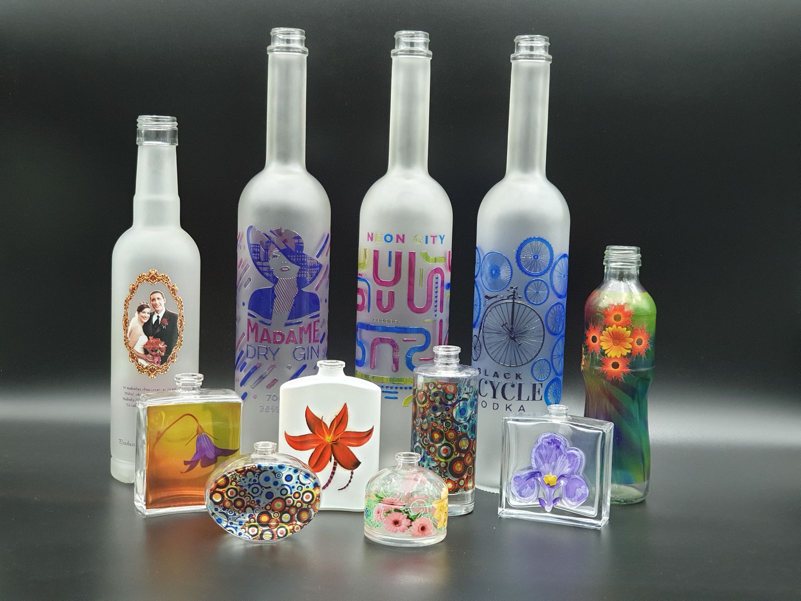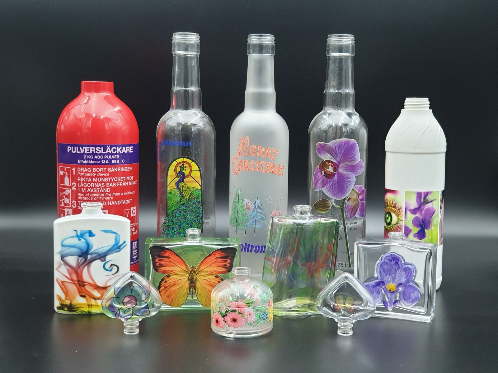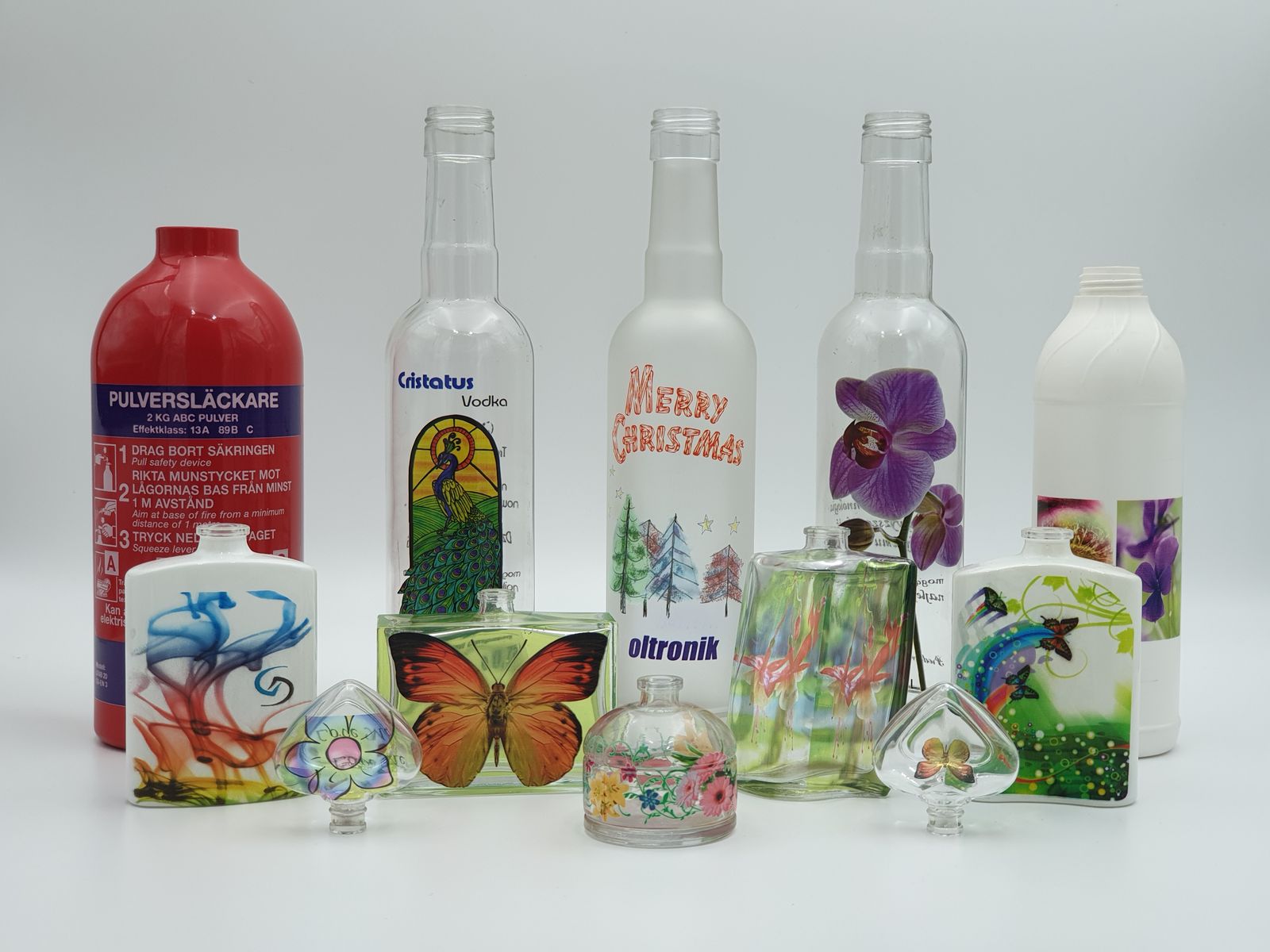Przykłady druku na przedmiotach wykonanych ze szkła, metalu i plastiku.