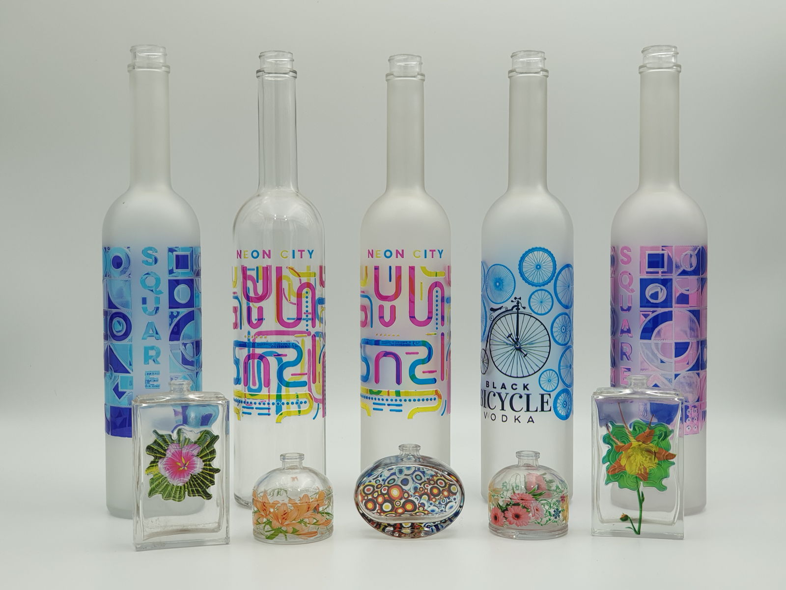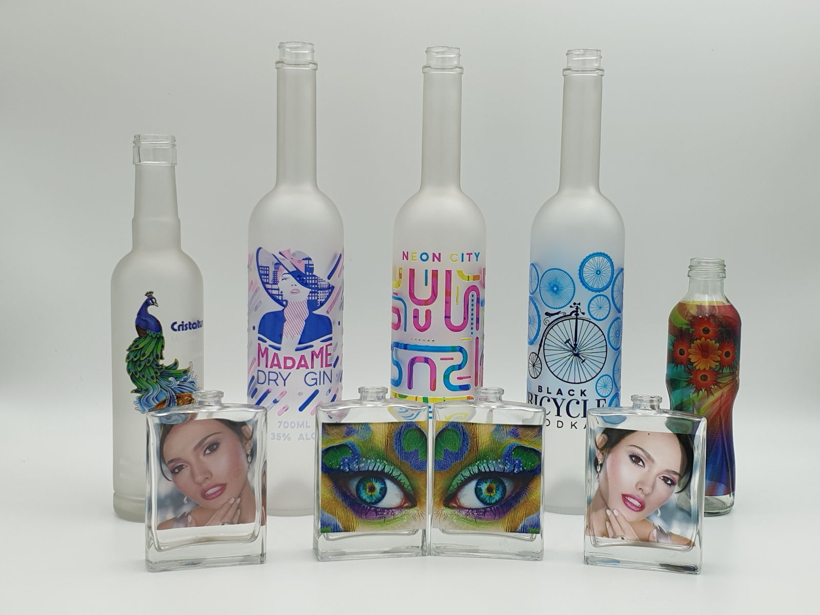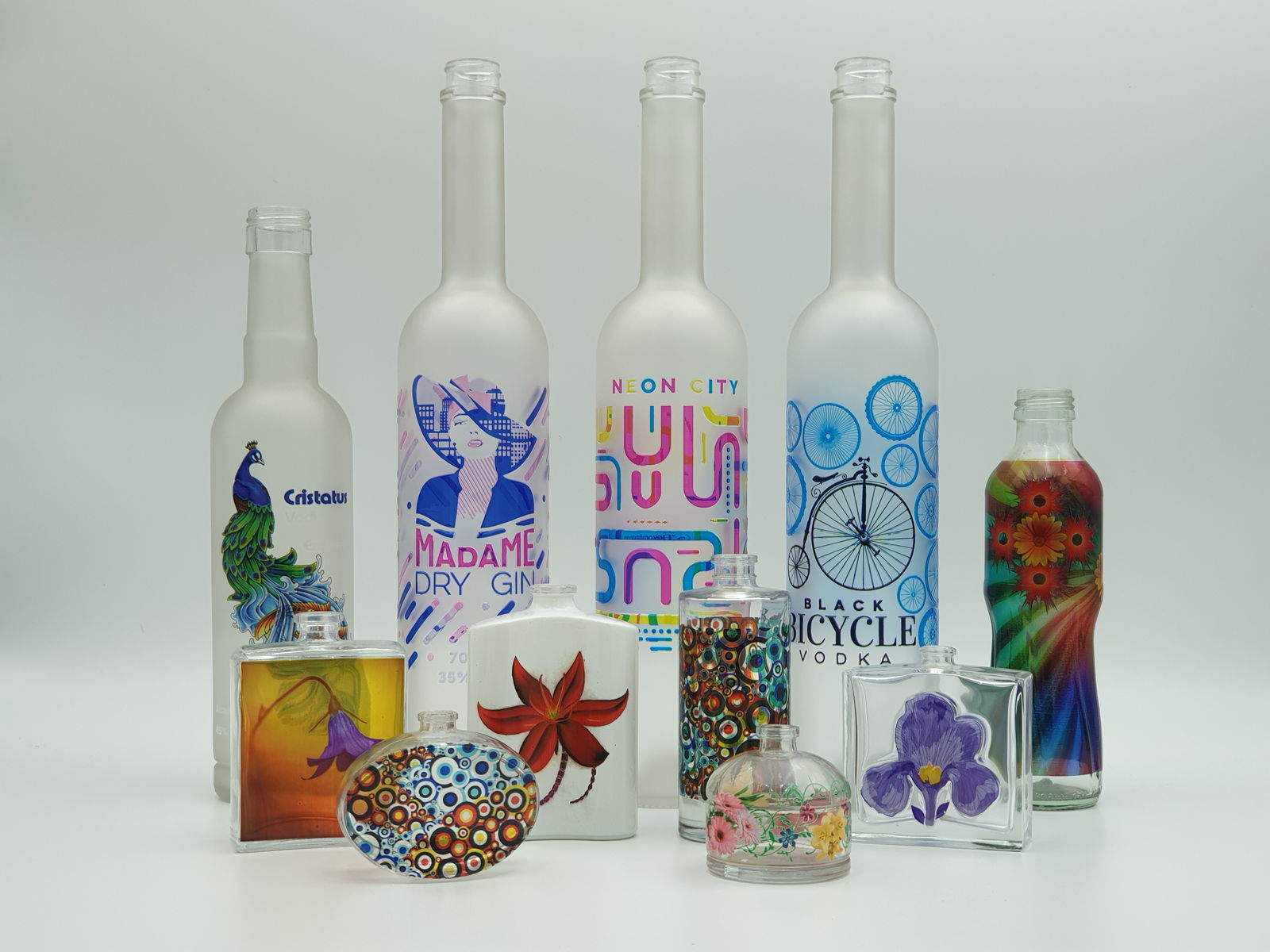Przykłady druku na przedmiotach wykonanych ze szkła, metalu i plastiku.