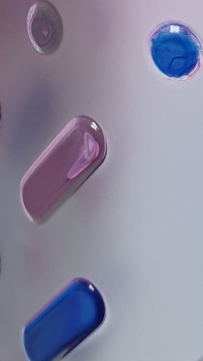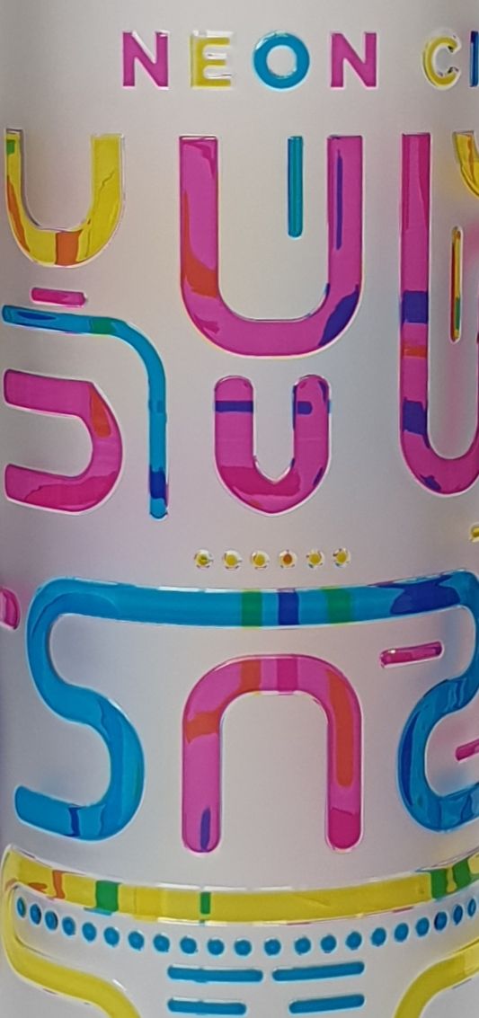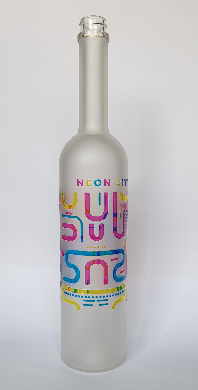 Zadruk grubymi warstwami w powiększeniu (na warstwach widać refleksy świetlne od zadruków na przeciwnej stronie butelki).